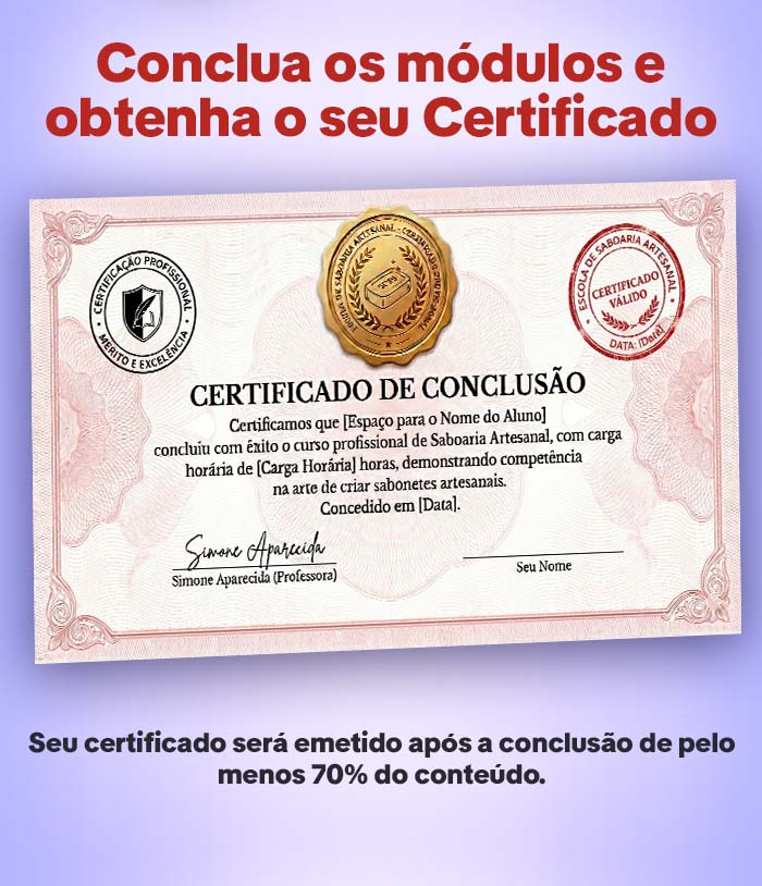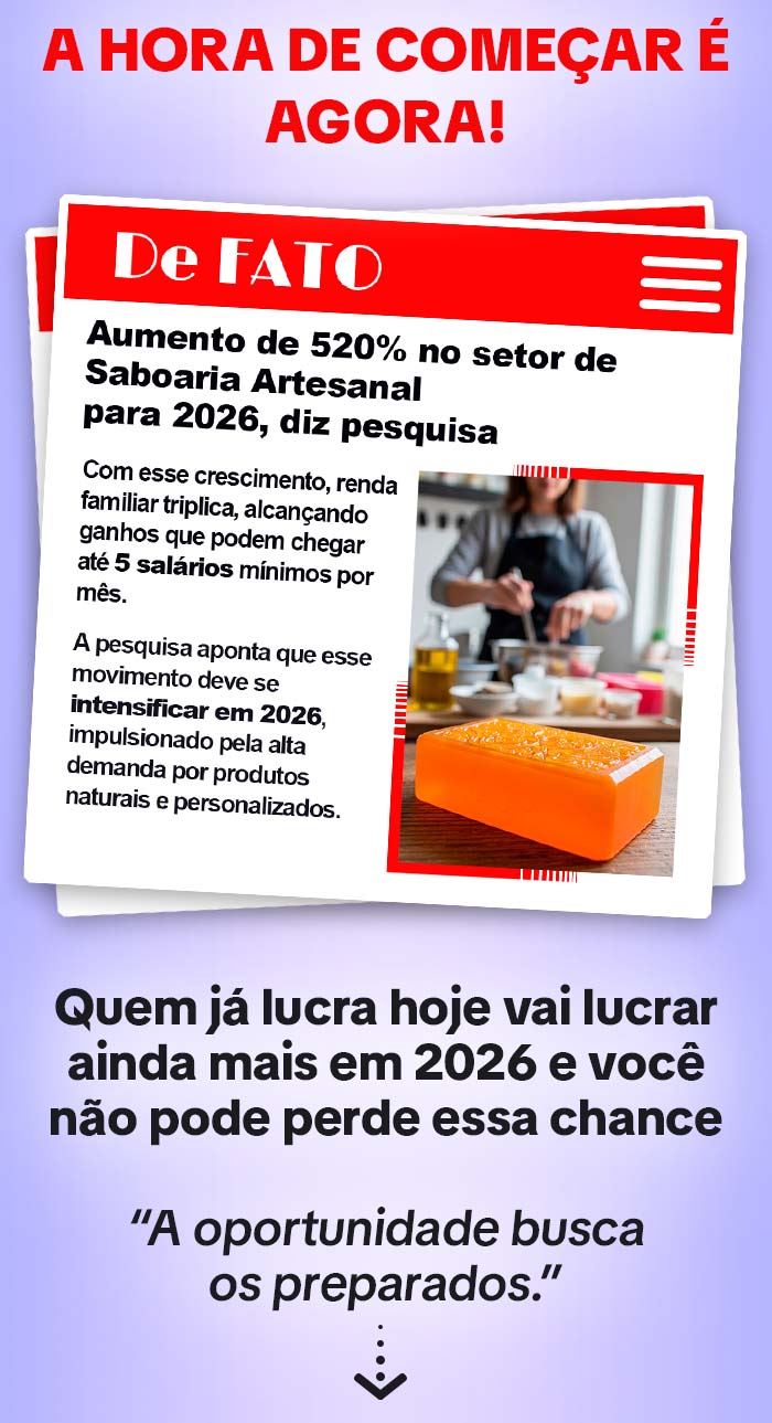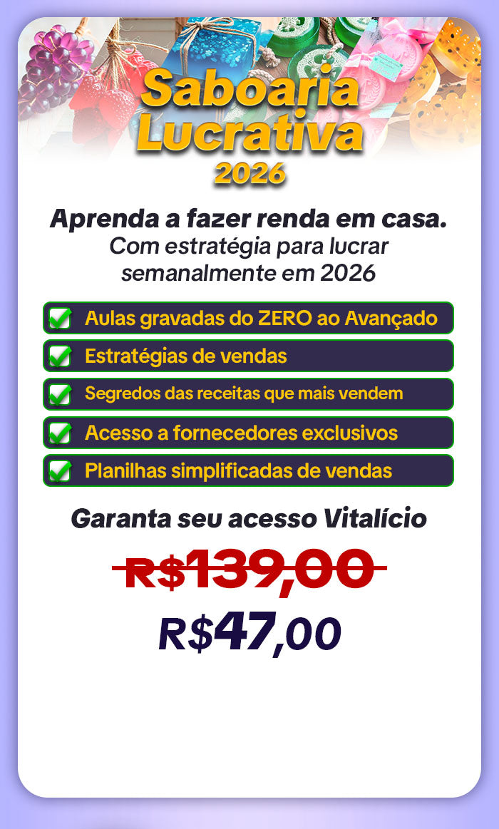 Saboaria Lucrativa 2026 é um curso online completo que ensina, do zero, como produzir sabonetes artesanais e transformar essa habilidade em uma fonte de renda. O conteúdo foi desenvolvido para quem deseja aprender saboaria de forma prática, organizada e com foco em resultados.